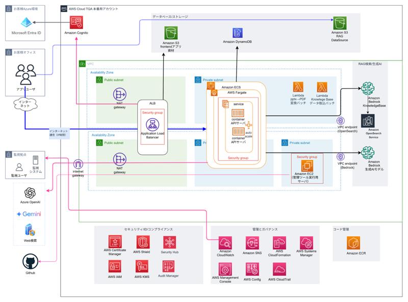 東急建設では2025年9月より、各種AWSサービスを組み合わせたRAGシステムの本番運用を開始した。新たな生成AI環境は「To Question AIDE (TQA)」と呼ばれ、海外拠点を含む全社員が利用できる体制にある。現在は主に文章の要約や翻訳、定型文書の作成補助といった用途で使用され、業務活用シーンを徐々に広げている。